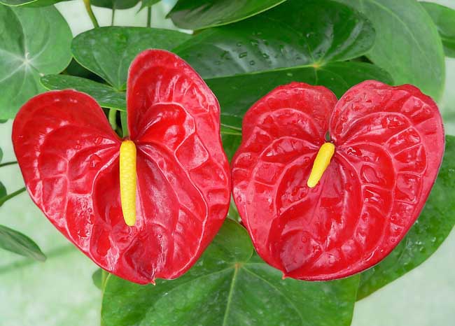 紅掌葉顏色深綠,心形,厚實(shí)堅(jiān)韌,花蕊長(zhǎng)而尖,有鮮紅色、白色或者綠色,周圍是紅色、粉色或魄的佛焰苞,全都有毒。