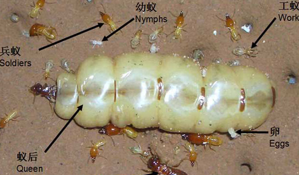 兵蟻是白蟻群體中變化較大的品級,除少數(shù)種類缺兵蟻外,一般從3-4齡幼蟻開始,部分幼蟻分化為色澤較淡的前兵蟻,進(jìn)而成為兵蟻,是群體的防衛(wèi)者,雖有雌雄之分,但不能繁殖,頭部長而高度骨化,上顎特別發(fā)達(dá),但已失去了取食功能,而成為御敵的武器,還可用上顎堵塞洞口、蟻道或王宮入口,由于失去了取食功能,因而食物由工蟻飼喂。